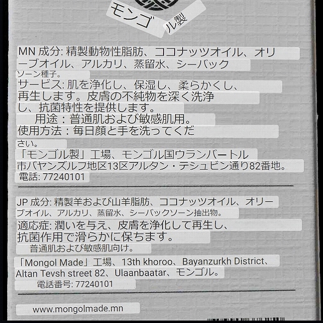 成分: 精製羊および山羊脂肪、ココナッツオイル、オリーブオイル、アルカリ、蒸留水、シーバックソーン抽出物