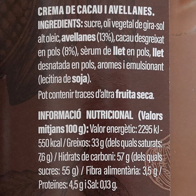 砂糖、高オレイン酸ヒマワリ植物油、ヘーゼルナッツ (13%)、脱脂ココアパウダー (8%)、ホエイパウダー、脱脂粉乳、香料、乳化剤 (大豆レシチン)。